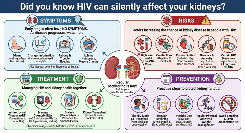 Learn how Human Immunodeficiency Virus (HIV) affects your kidney health. Understand symptoms, HIVAN risks, ART medication safety, tests, and prevention tips from the doctors and experts.